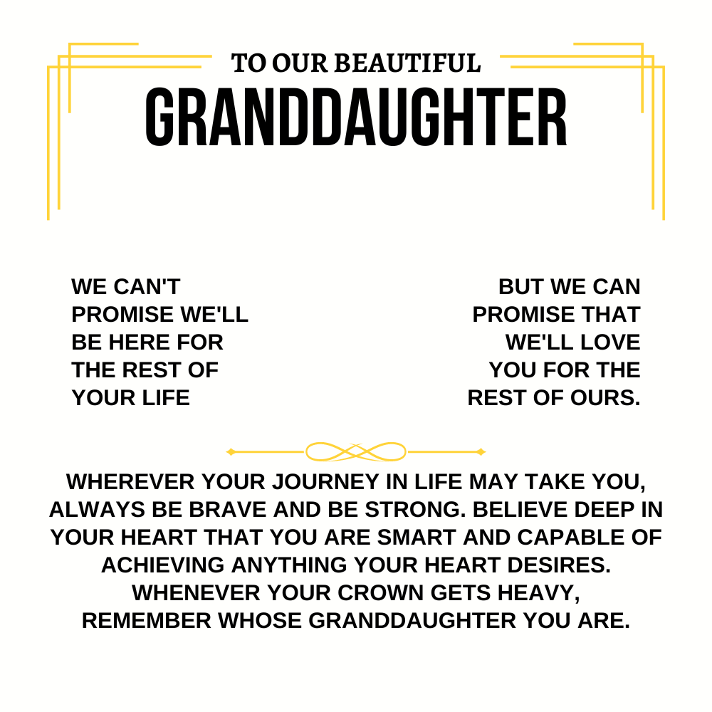 "TO MY BEAUTIFUL GRANDDAUGHTER - I can't promise I'll be here for the rest of your life, but I can promise that I'll love you for the rest of mine. Wherever your journey in life may take you, always be brave and be strong. Believe deep in your heart that you are smart and capable of achieving anything your heart desires. Whenever your crown gets heavy, remember whose Granddaughter you are. LOVE, GRANDMA"