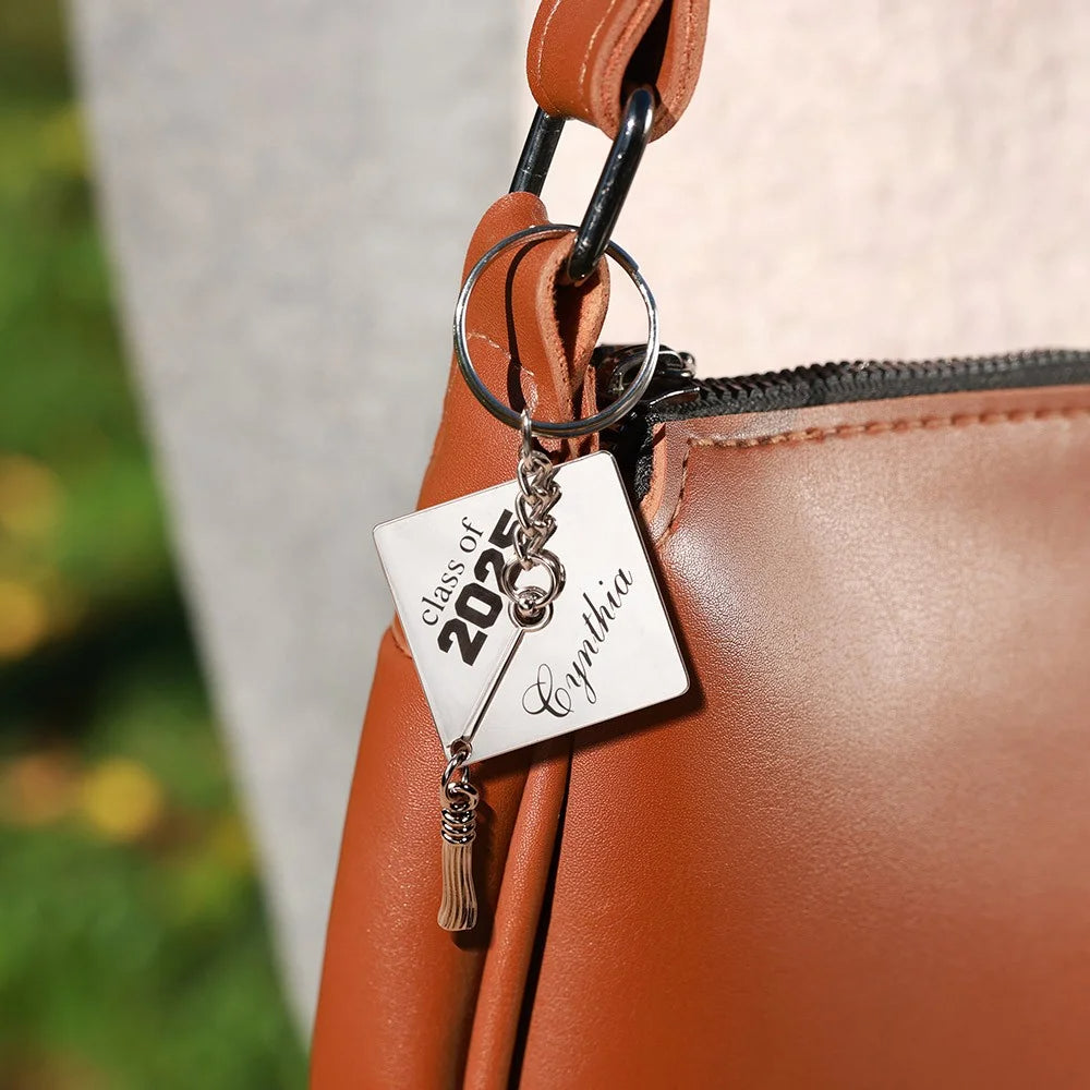 👩🎓👨🎓Featuring a miniature graduation cap design customized with your name, this durable keychain serves as both a practical key organizer and stylish bag accessory. A sophisticated commemorative item that preserves the milestone of graduation while adding functional elegance to your everyday essentials.