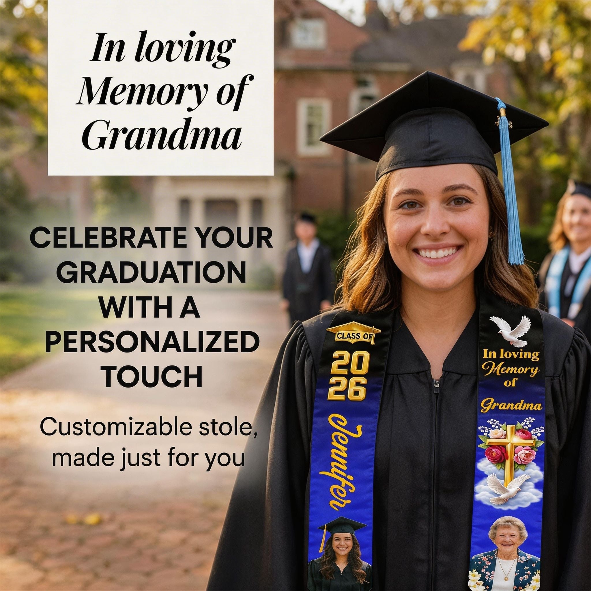 This custom commemorative graduation sash is the perfect way to pay tribute to those who will forever remain in the graduate's heart. 💞