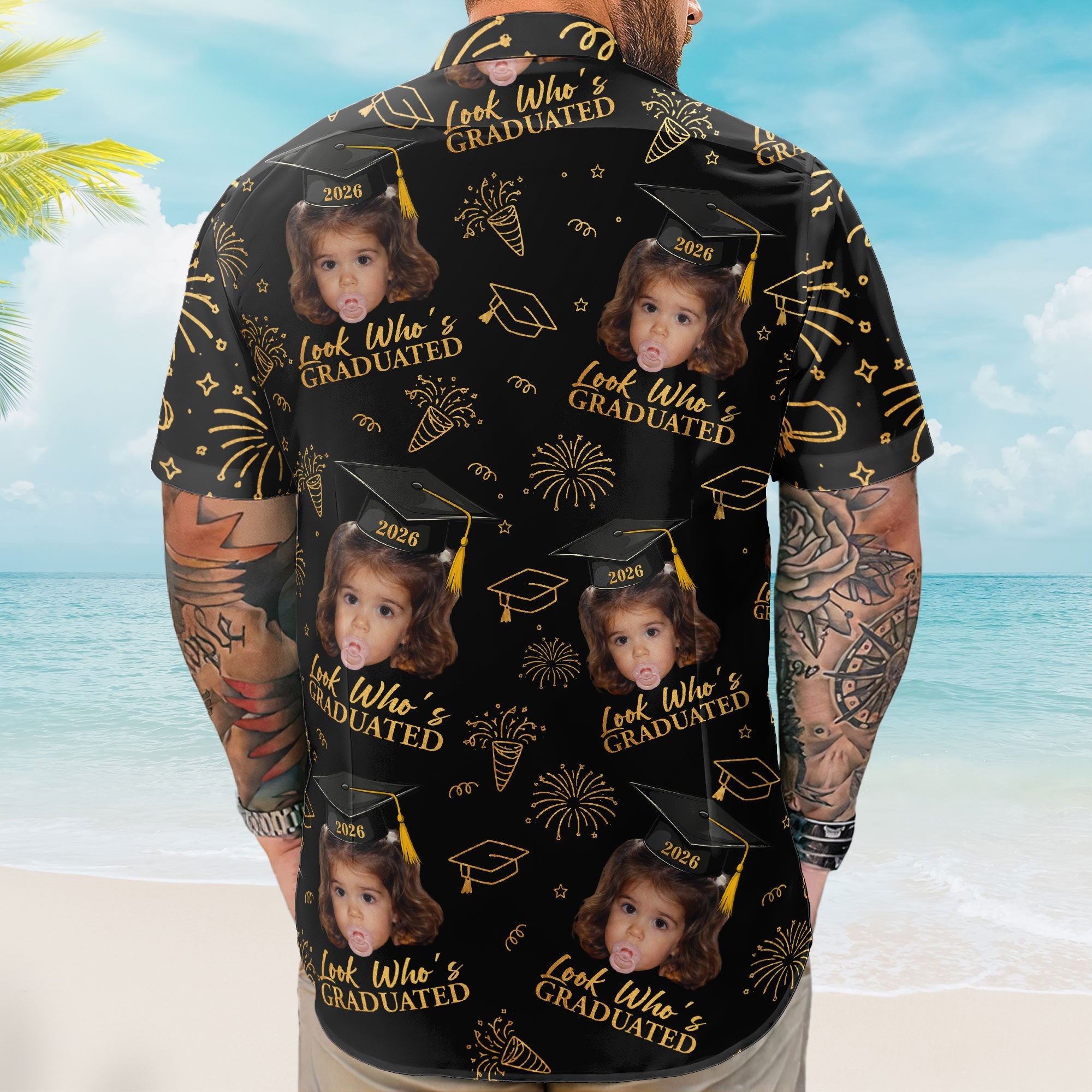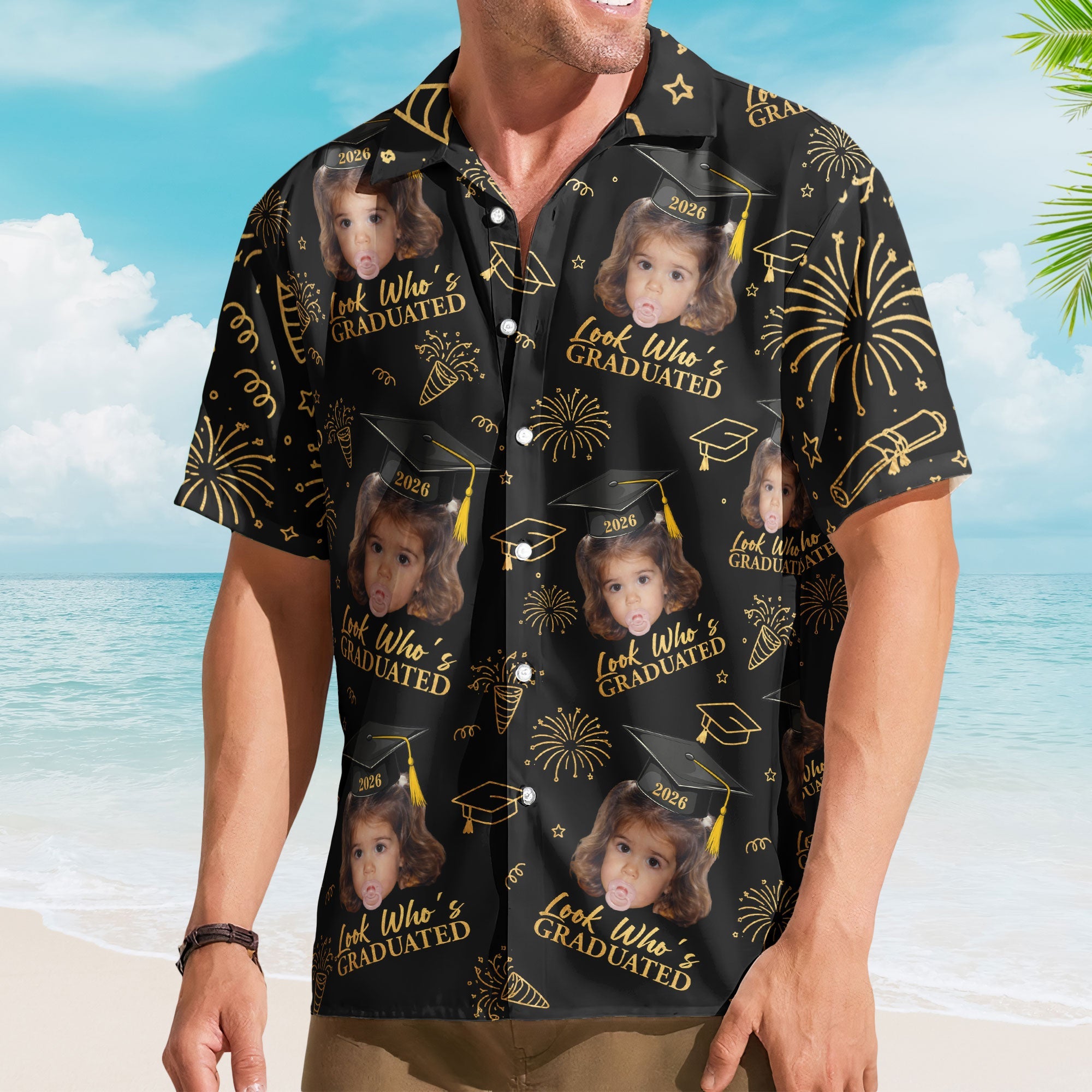 Custom Hawaiian shirt featuring their adorable childhood photoābecause nothing says "congrats, grad" quite like their own baby face on a tropical print.