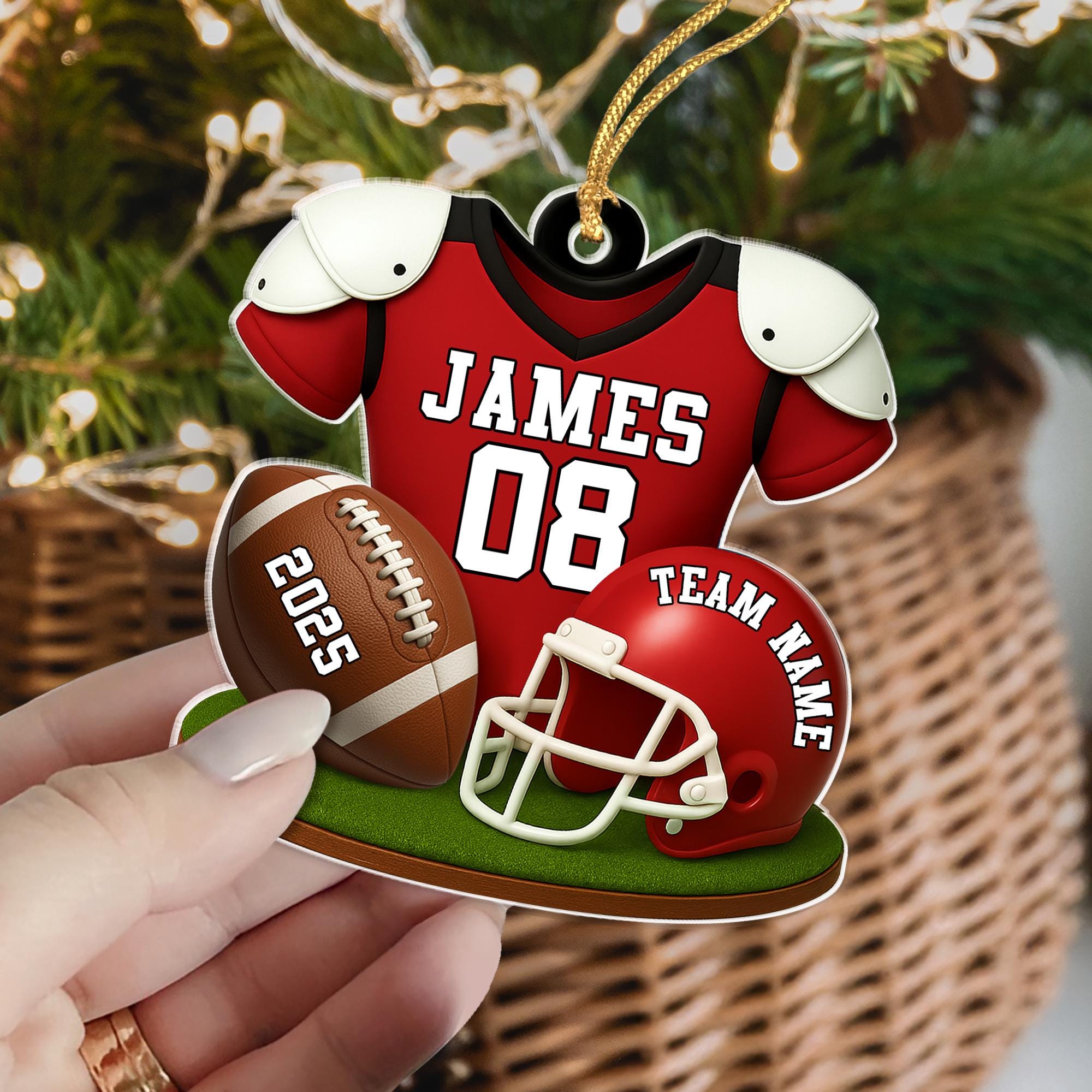Score big this holiday season with our playful American Football ornament! Made from clear acrylic, this personalized decoration lets you add a name or message, making it a perfect gift for football lovers and players. Lightweight and durable, it brings sporty cheer and festive fun to any Christmas tree. Kick off your celebrations with a touch of game day spirit!🎄🏈
